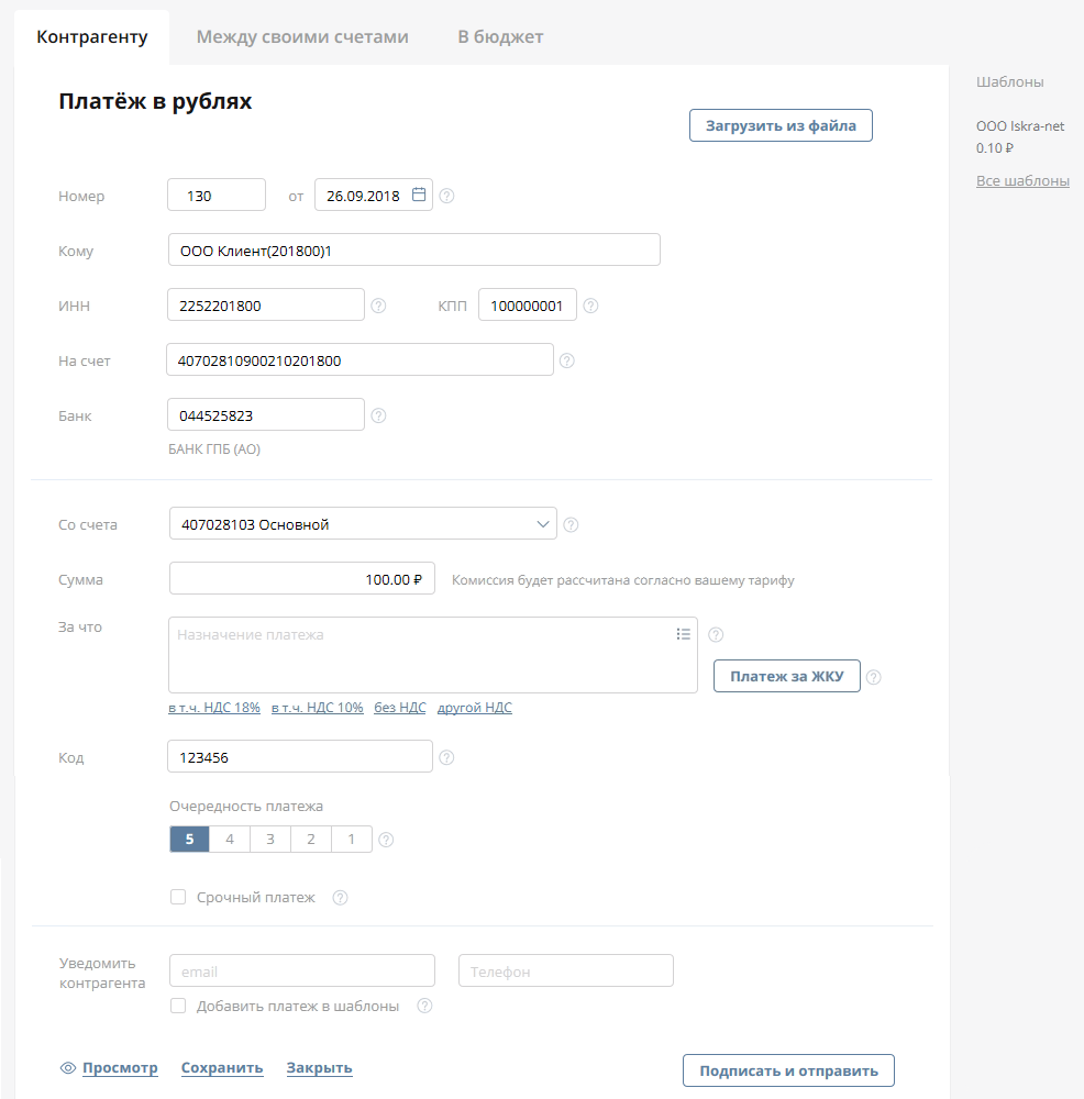 Платеж контрагенту. В рамках данного типа платежного поручения реализуется возможность перевода средств какому-либо физическому или юридическому лицу.