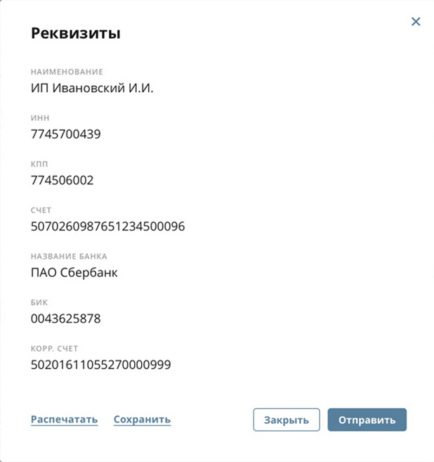 Нажмите кнопку Распечатать, чтобы отправить реквизиты на печать.