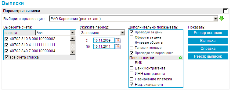 Настройте параметры отбора данных о выписках и приложениях к ним, реестре выписок, реестре остатков в соответствии с разд. «Задание параметров отбора выписок / справок, приложений к ним и данных об остатках по счетам».